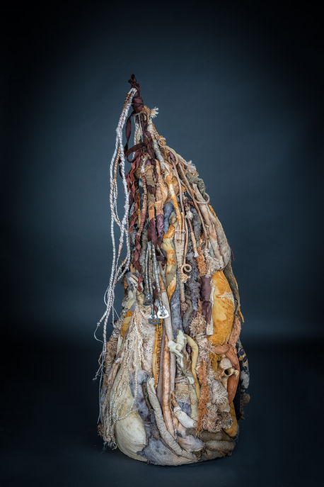 My choices of materials are at the foundation of my work. I chose to work primarily with recycled textiles and found objects. Interaction with material objects is a part of our daily life. Those items range from deeply symbolic to completely disposable. We are all interconnected through this commonplace matter. Articles of clothing and pieces of domestic life carry the residue of memories and experience both of the individuals and the collective society. When a throwaway object is elevated from discarded to respected as a medium for art, it becomes an artifact imbued with history and power.